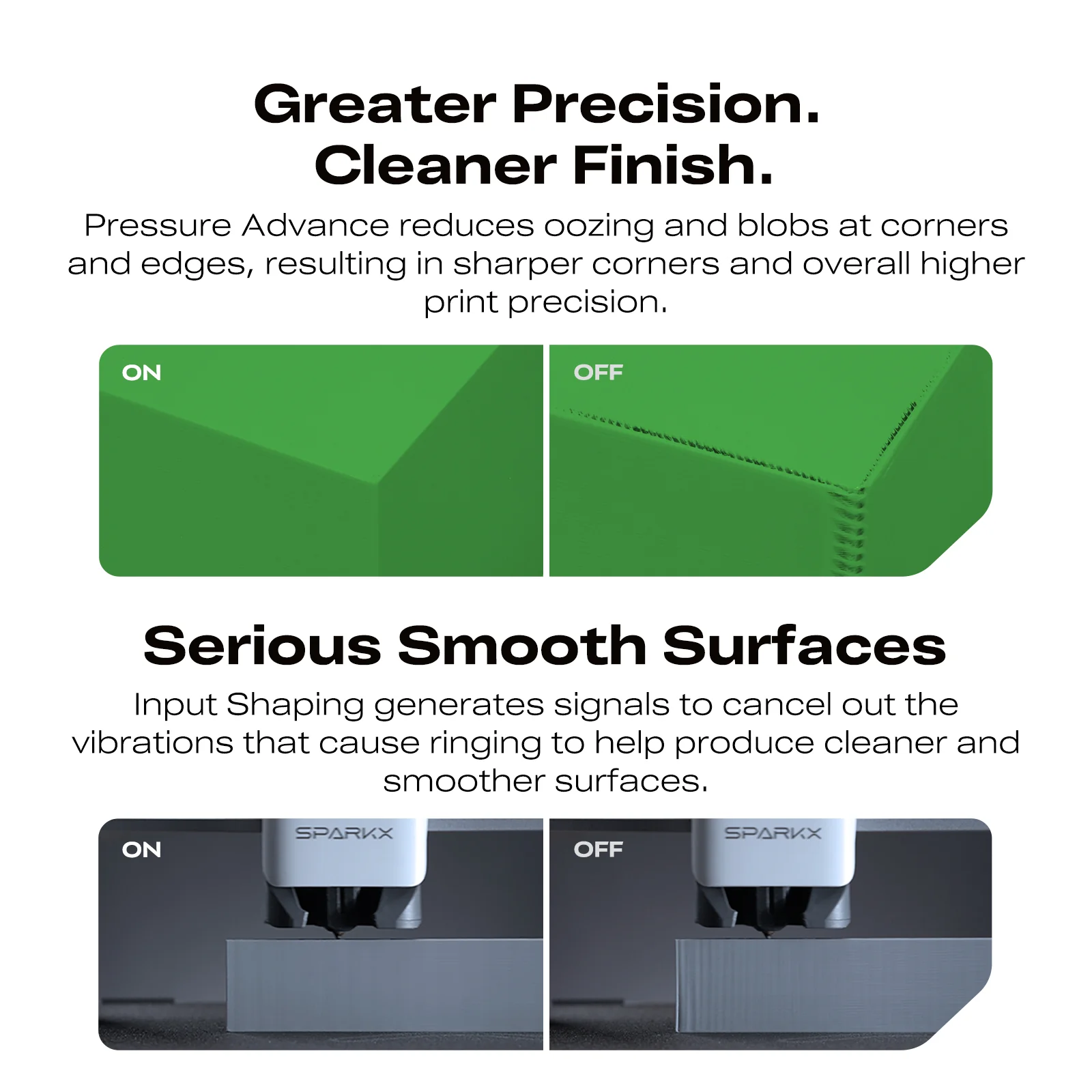 Độ chính xác cao hơn. Bề mặt in sắc nét hơn. Điều chỉnh phản hồi của máy in theo tốc độ thay đổi trong thời gian thực, Pressure Advance giảm hiện tượng lem mực và vón cục ở các góc và cạnh, mang lại các góc sắc nét hơn và độ chính xác in tổng thể cao hơn