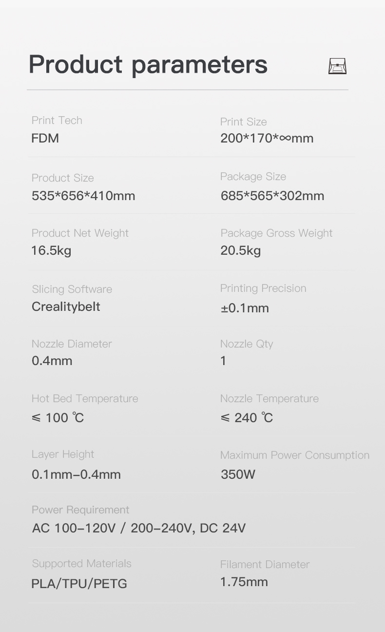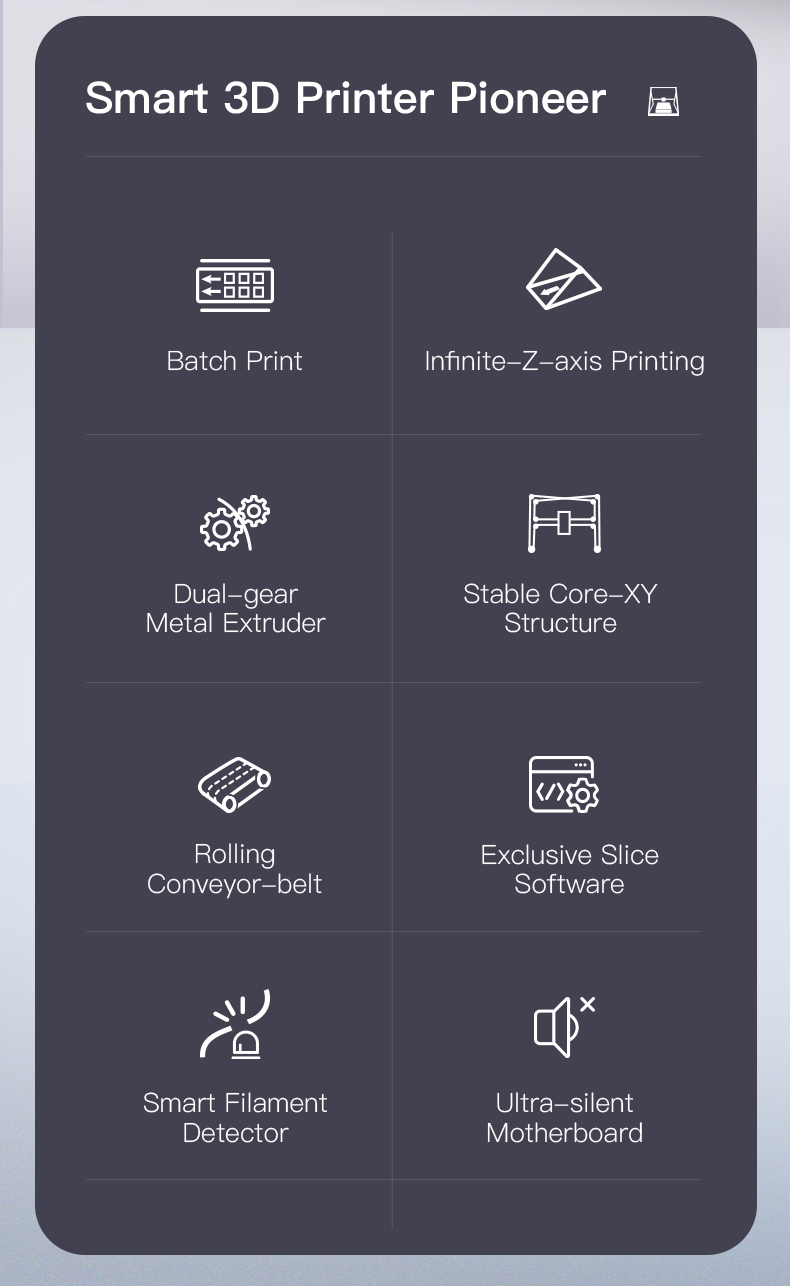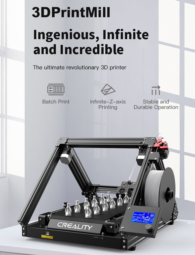 _3DPrintMill là tính năng in với độ dài vô hạn và in số lượng lớn, do đó tiết kiệm thời gian in ấn và tiết kiệm chi phí. Vành đai Z vô hạn đặc biệt là máy in 3D Creality đầu tiên nhận ra khối lượng xây dựng vô hạn trên thế giới.