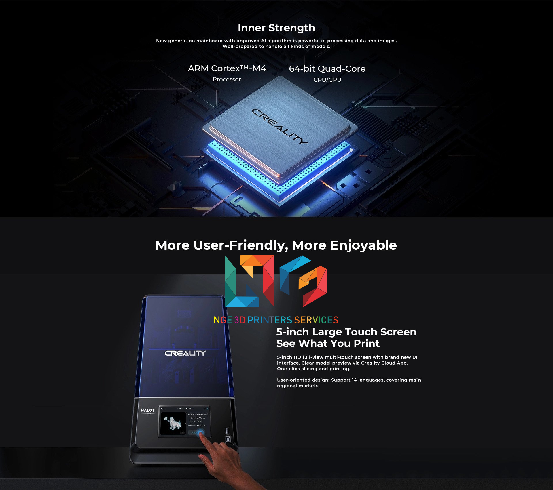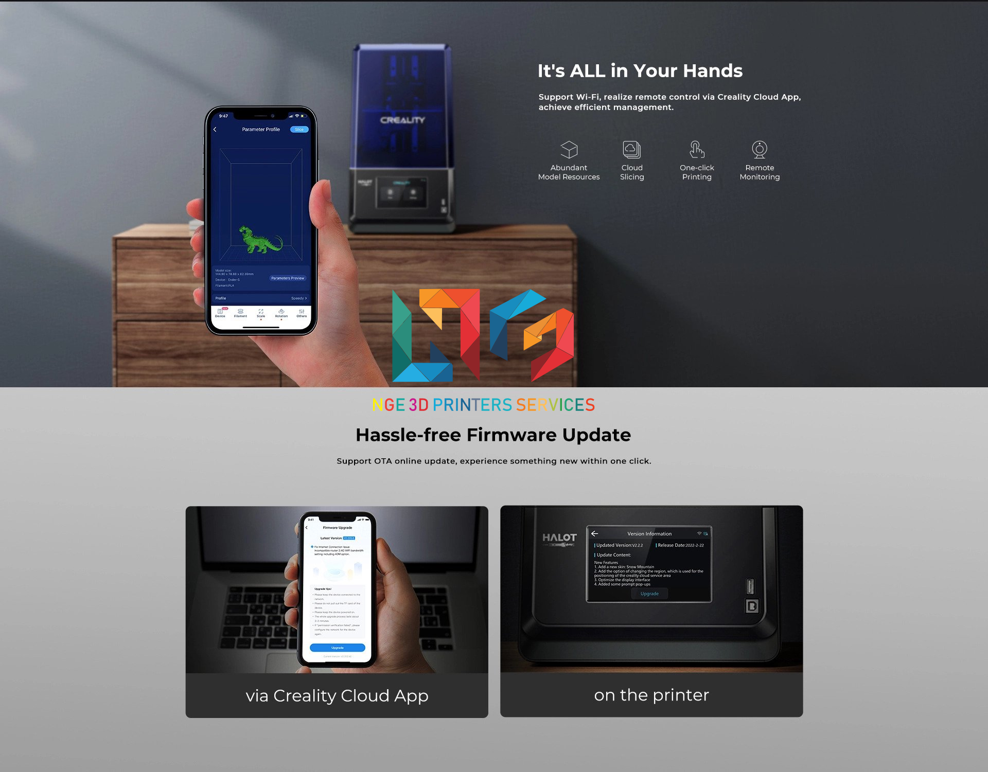 Creality Cloud APP để theo dõi tiến độ in, điều chỉnh cài đặt in, Bắt đầu / Dừng bản in. Wi-Fi tích hợp cho phép nâng cấp chương trình cơ sở bằng một cú nhấp chuột.