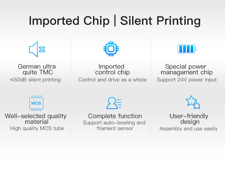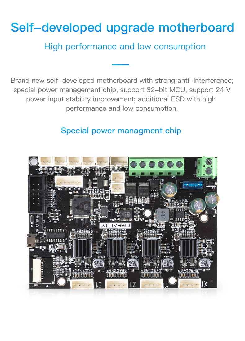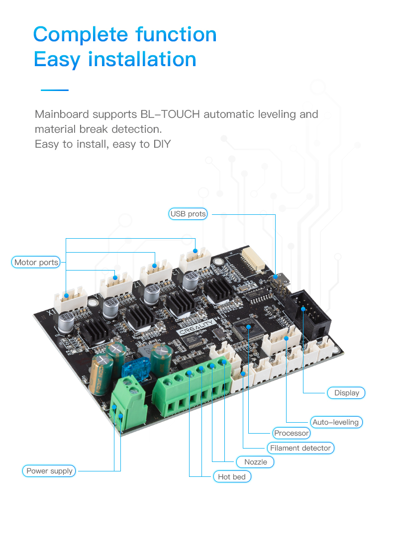 Hỗ trợ chức năng như in trực tuyến, cân bằng BL-Touch, cảm biến chạy dây tóc, v.v. (USB, thẻ TF, động cơ, màn hình, tự động cân bằng, bộ xử lý, cảm biến chạy sợi nhựa, hotend, đệm nóng, cung cấp điện)