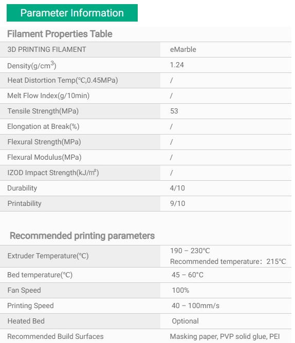 ***Recommended printing parameters =>https://www.esun3d.com/uploads/eSUN_eMarble-Filament_TDS_V4.0.pdf