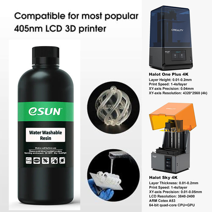 _Nhựa khuôn LCD chuyên nghiệp: Được thiết kế đặc biệt cho nguồn sáng LED để đạt được chất lượng in tốt hơn. eSUN Water Washable Resin tương thích với hầu hết các máy in 3D LCD để tạo mẫu nhanh với kiến trúc, đồ trang sức, nha khoa, hoạt hình,v.v.