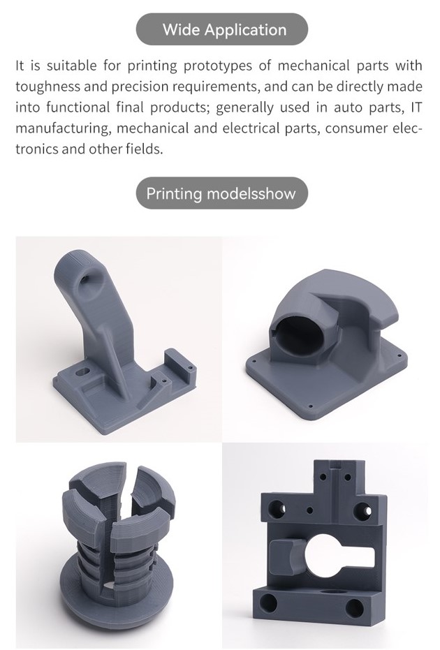 _Nó phù hợp để in nguyên mẫu của các bộ phận cơ khí với yêu cầu về độ bền và độ chính xác, cũng như một số bộ phận cấu trúc và chức năng, với ứng dụng rộng rãi trong thiết kế công nghiệp, điện tử tiêu dùng, phụ tùng ô tô, sản xuất CNTT, máy móc và lĩnh vực điện.