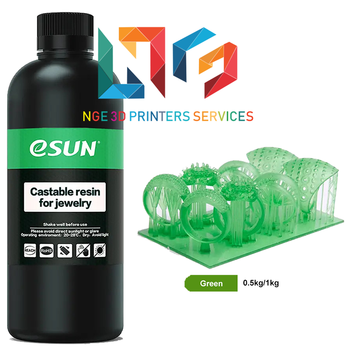 _ESUN Castable Resin for Jewelry màu Green, Được thiết kế đặc biệt cho nguồn sáng LCD/LED để đạt được chất lượng in tốt hơn. Tương thích với hầu hết các máy in LCD sử dụng ánh sáng bước sóng 405nm. Nhựa đúc làm đồ trang sức có hàm lượng sáp cao. Nhiệt độ đúc từ 730-780℃.