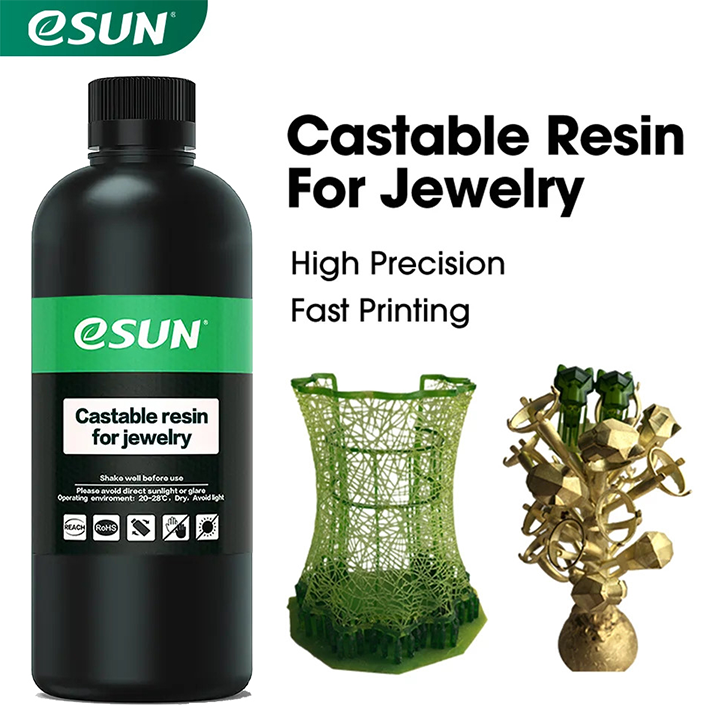_ESUN Castable eResin for Jewelry này khá độc đáo so với nhiều loại nhựa 3D khác trên thị trường, và được chế tạo đặc biệt để phân hủy thành hư không khi cháy, không để lại tro hoặc hóa chất còn sót lại. Điều này làm cho nó trở nên lý tưởng cho việc đúc sáp bị mất và phục vụ cho nhu cầu ngày càng phổ biến của các nhà sản xuất đồ trang sức, những người cần tạo ra các mẫu nhẫn và phụ kiện khác hoàn hảo theo quy mô - được làm với kích thước chính xác để vừa với đá quý và các phụ kiện trang trí khác.
