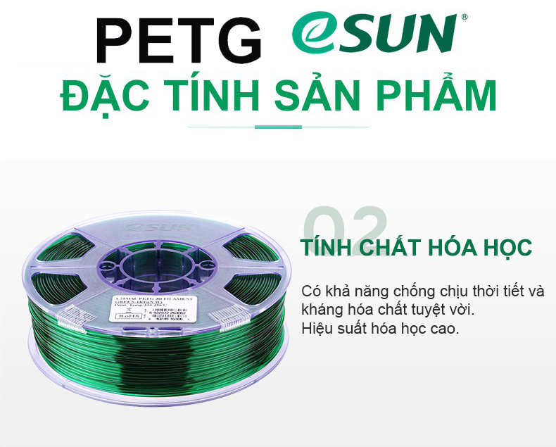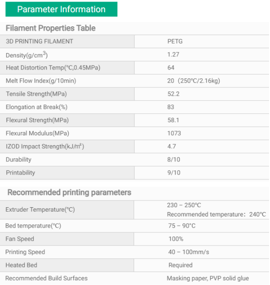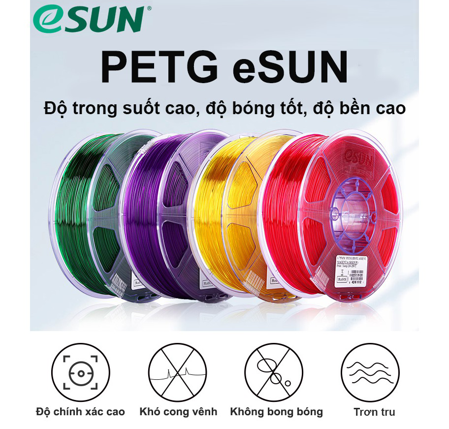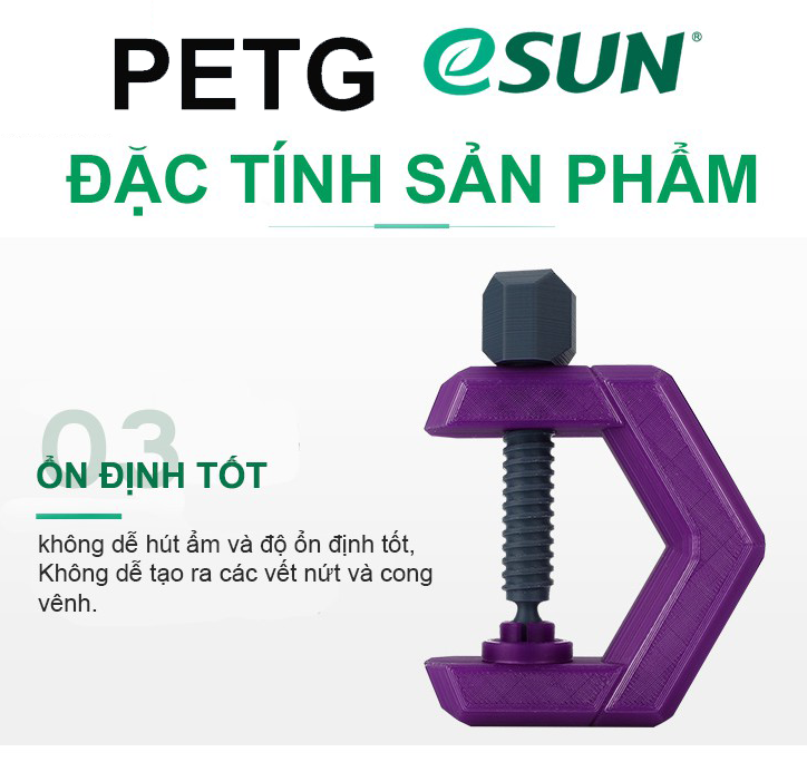PETG là vật liệu hiệu suất cao với khả năng chống nước, kháng hóa chất và độ dẻo dai cao. Nó cứng hơn ABS; Sản phẩm in ra có bề mặt mờ và mịn. Dễ dàng in dưới dạng PLA mà không cần buồng nhiệt độ.