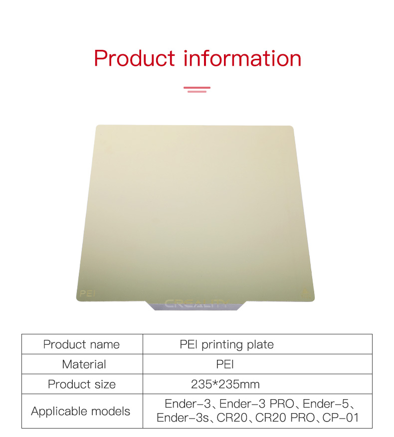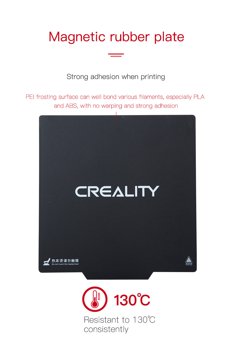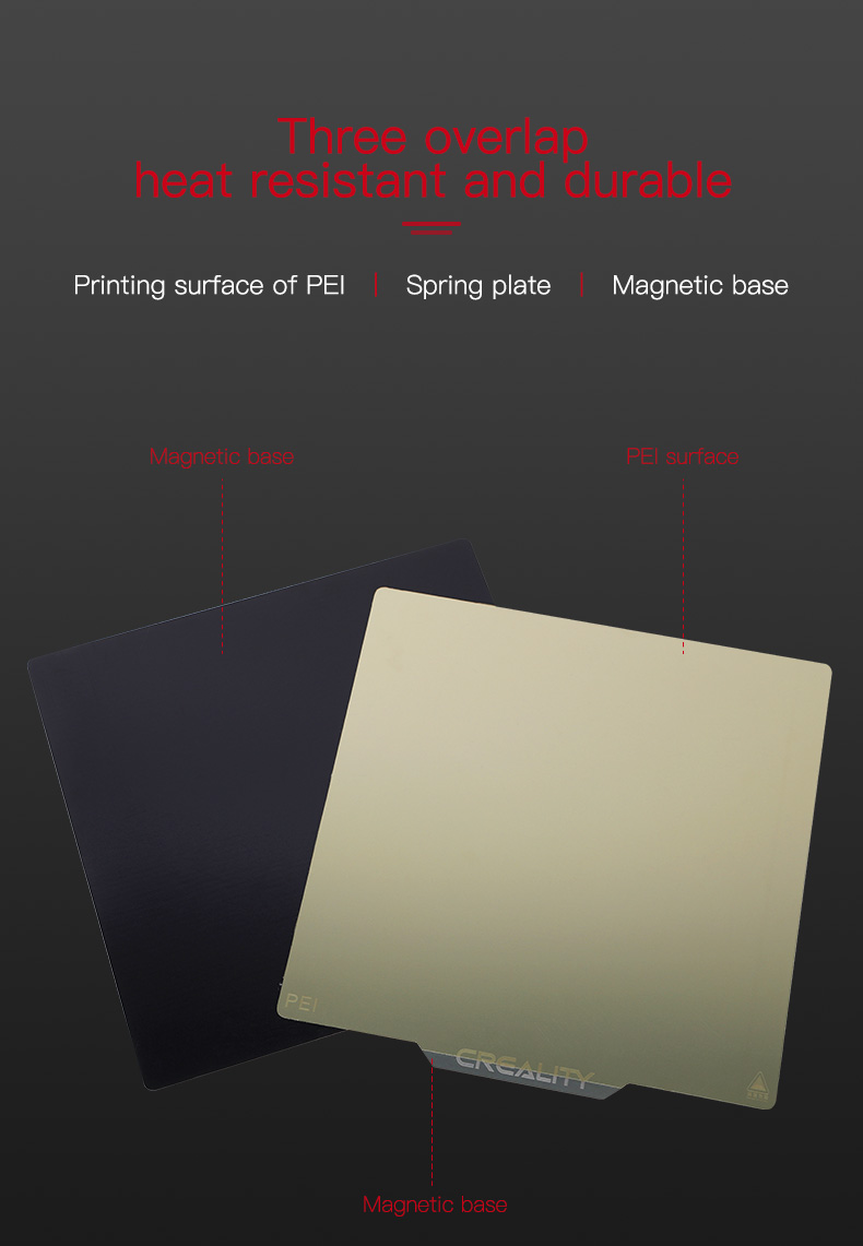 +Sơn tĩnh điện PEI nguyên bản có khả năng chịu nhiệt. Tấm lò xo bằng thép cứng có khả năng chịu nhiệt độ 200℃ một cách nhất quán mà không bị biến dạng