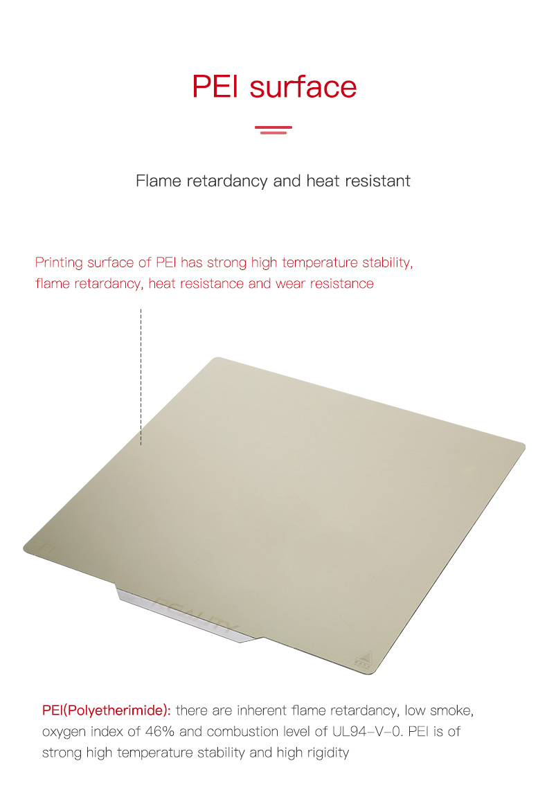 +Bề mặt in của PEI có độ ổn định nhiệt độ cao, chống cháy, chịu nhiệt và chống mài mòn