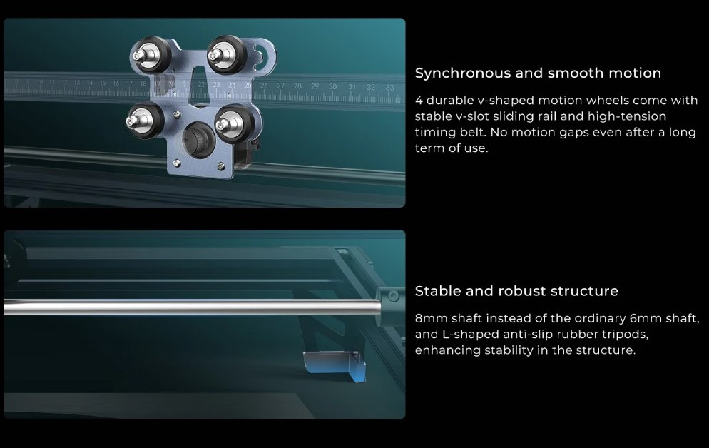 _4 bánh xe chuyển động hình chữ v bền bỉ đi kèm với ray trượt rãnh chữ v ổn định và đai thời gian có độ căng cao. Không có khe hở chuyển động kể cả sau thời gian dài sử dụng.
