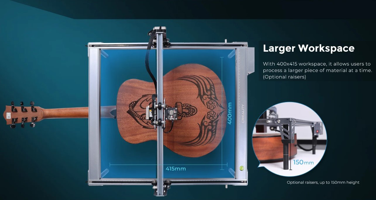 Với không gian làm việc 400*415, nó cho phép người dùng xử lý một phần lớn vật liệu cùng một lúc. (Chiều cao tùy chọn, lên đến 150mm)