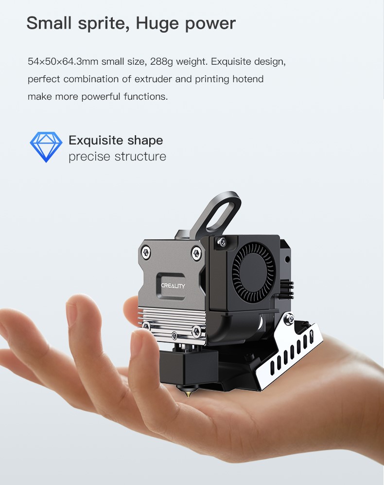 +Kích thước nhỏ 54x50x64.3mm, trọng lượng 288g. Thiết kế tinh tế, sự kết hợp hoàn hảo giữa máy đùn và máy in tạo ra nhiều chức năng mạnh mẽ hơn.