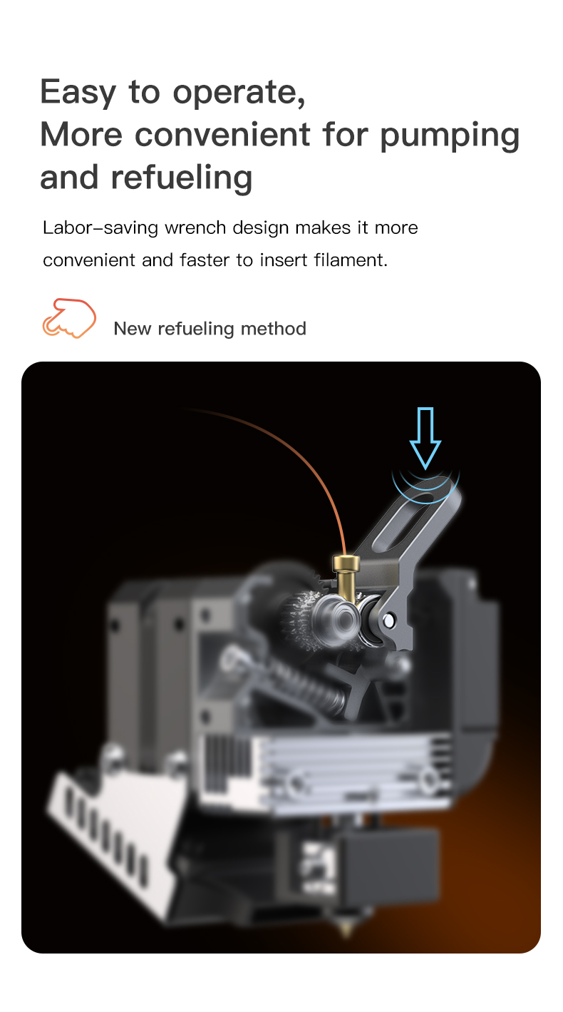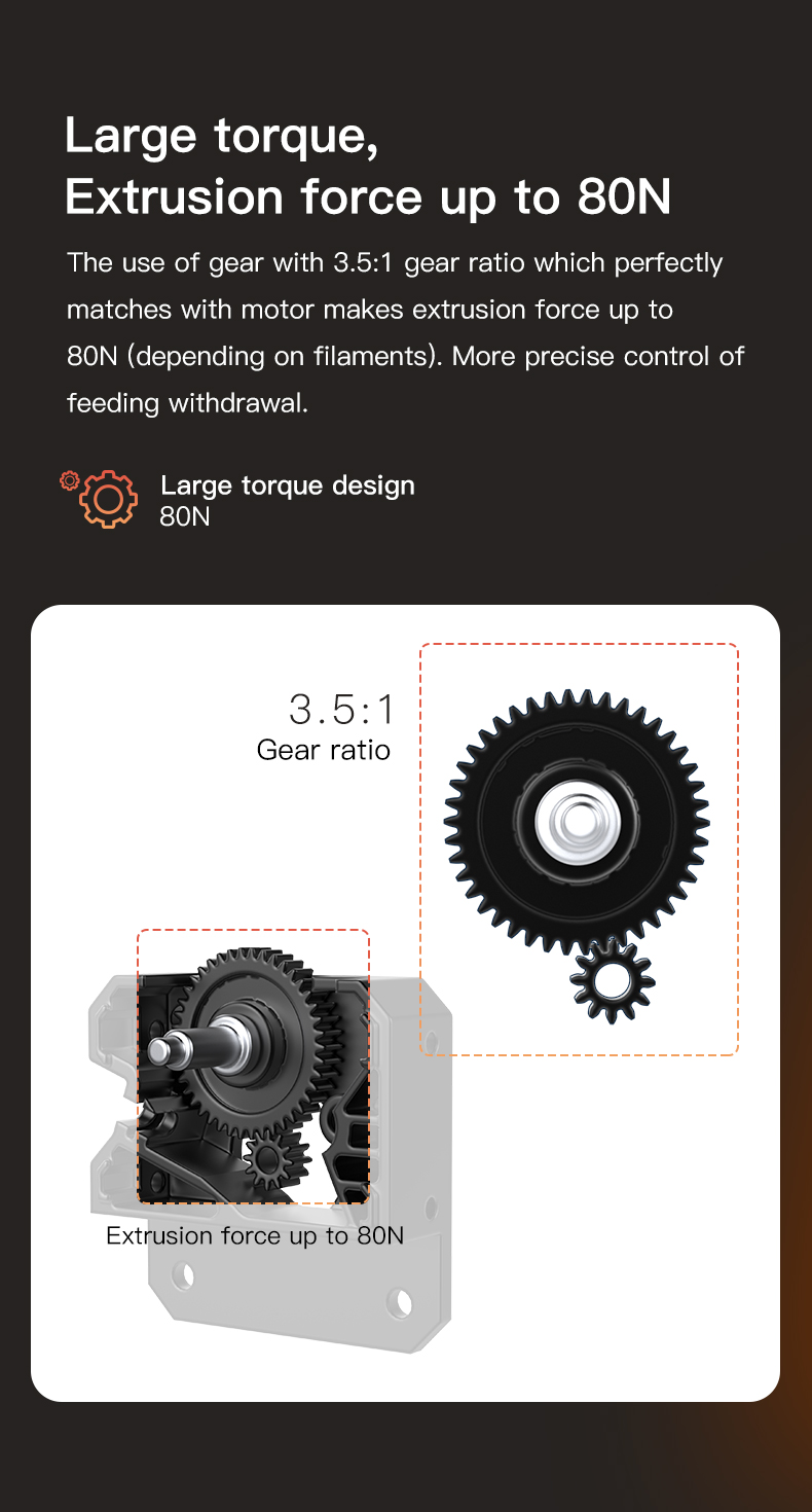 Việc sử dụng bánh răng với tỷ số truyền 3,5:1 kết hợp hoàn hảo với động cơ tạo ra lực đùn lên đến 80N (tùy thuộc vào sợi nhựa). Kiểm soát chính xác hơn việc rút và đẩy nhựa.