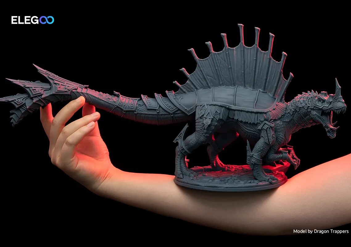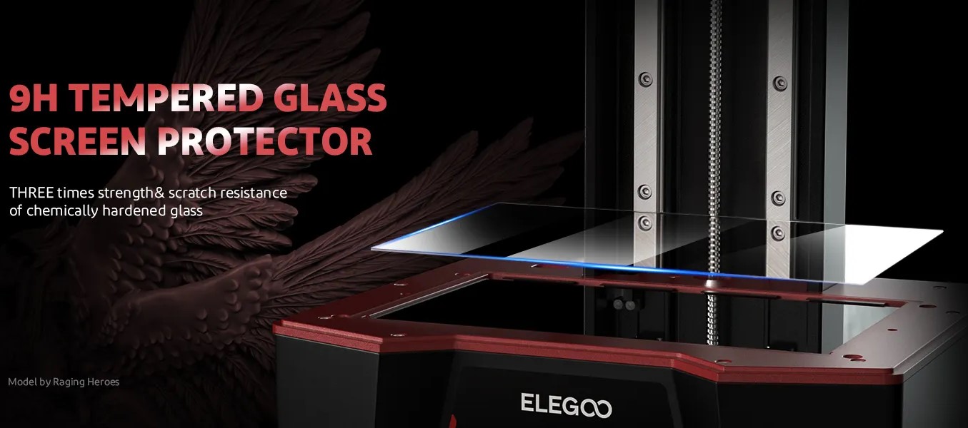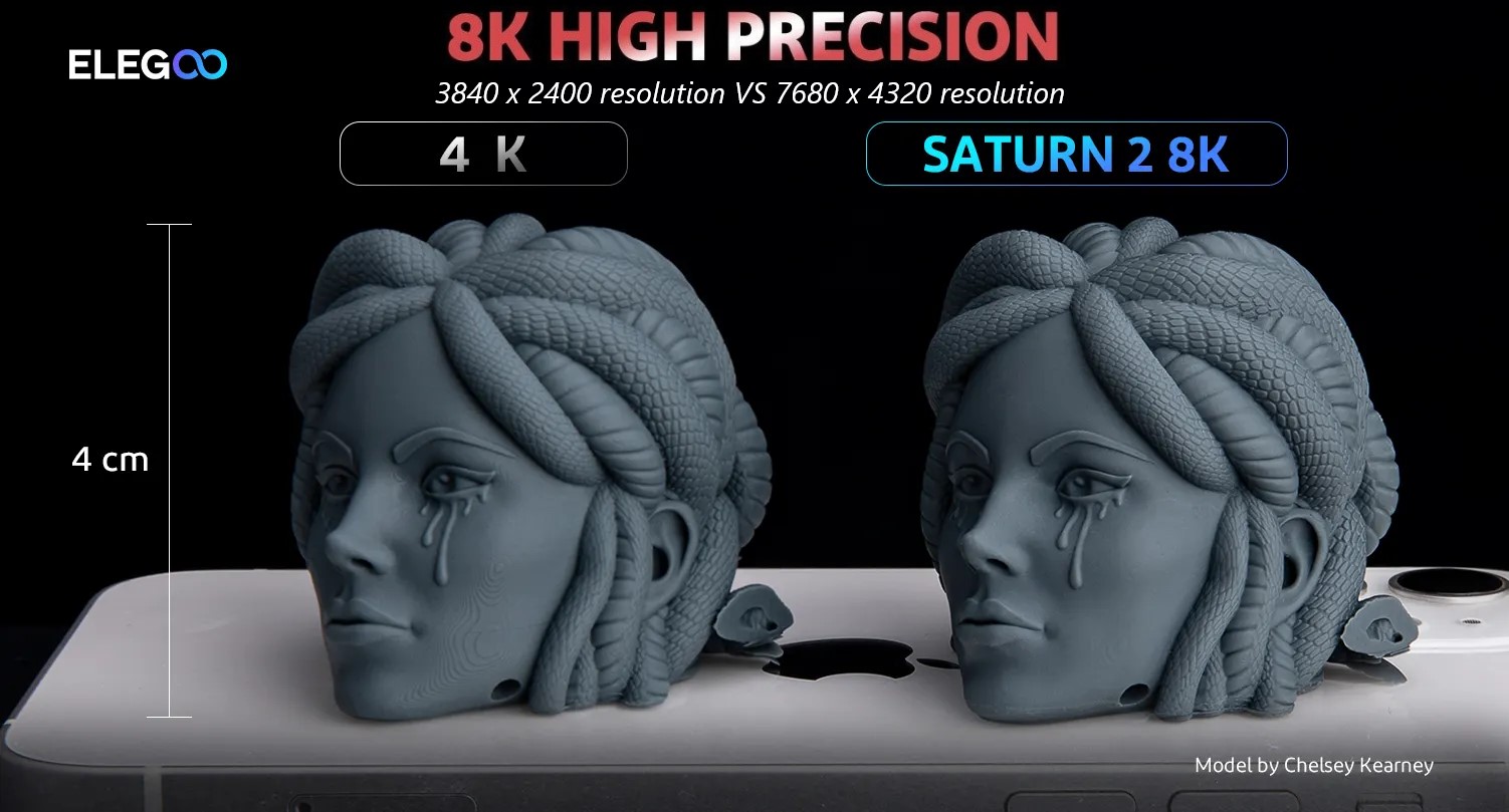 _【Màn hình LCD Mono 10" 8K】ELEGOO Saturn 2 sử dụng màn hình LCD Mono 8K 10 inch với độ phân giải HD 7680x4320 và độ phân giải XY siêu mịn 28,5 micron, xuất ra các mô hình 3D chi tiết vượt trội với thời gian xử lý chỉ 1-3 giây Mỗi lớp Kính cường lực chống xước phía trên màn hình LCD với độ cứng 9H giúp truyền sáng và bảo vệ tốt hơn.