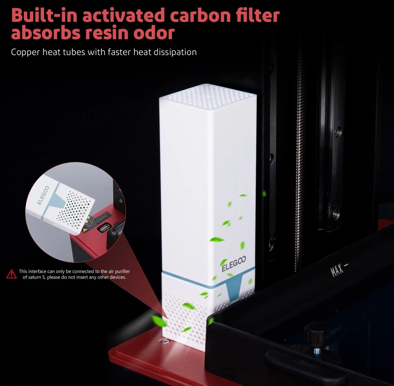 _【Môi trường in không mùi】Hệ thống lọc không khí với bộ lọc than hoạt tính có thể hấp thụ hầu hết mùi nhựa, tạo ra môi trường in trong lành không mùi. Các ống dẫn nhiệt bằng đồng dẫn nhiệt kép giúp truyền nhiệt nhanh hơn và hiệu quả tản nhiệt tốt hơn giúp kéo dài tuổi thọ của máy in 3D