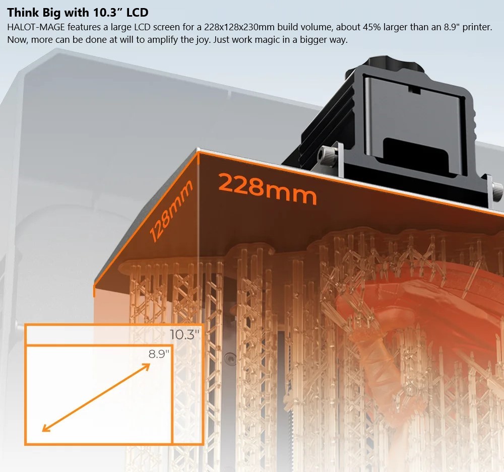 _HALOT-MAGE có màn hình LCD lớn 10,3'' cho khối lượng in 228x128x230mm, lớn hơn khoảng 45% so với máy in 8,9'.