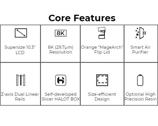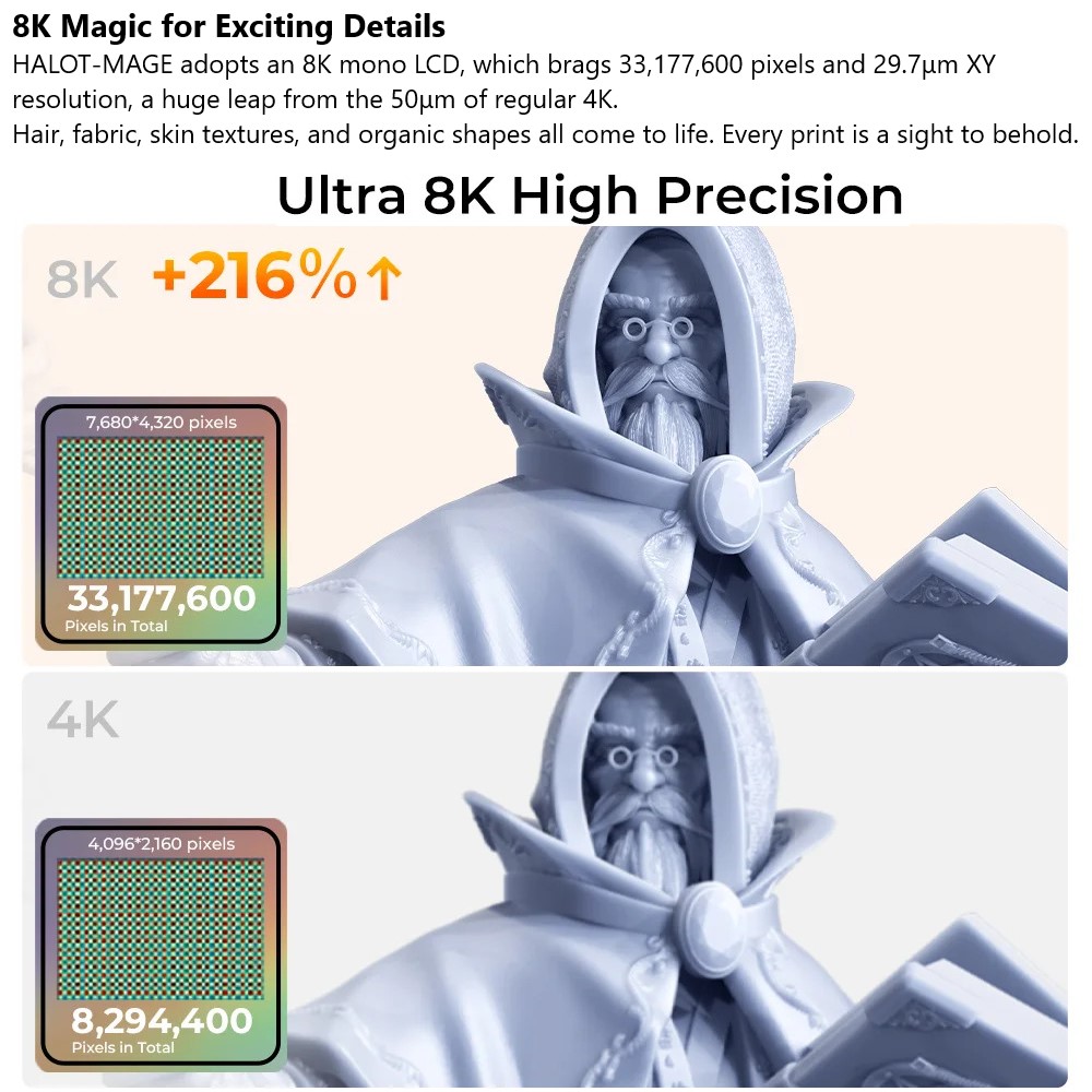 _HALOT-MAGE sử dụng màn hình LCD đơn sắc 8K, có 33.177.600 pixel và độ phân giải 29,7μm XY, một bước nhảy vọt so với 50μm của 4K thông thường