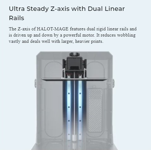 _Trục Z siêu ổn định của HALOT-MAGE có các đường ray tuyến tính cứng kép và được điều khiển lên xuống bằng một động cơ mạnh mẽ. Nó làm giảm đáng kể sự lắc lư và xử lý tốt các bản in lớn hơn, nặng hơn