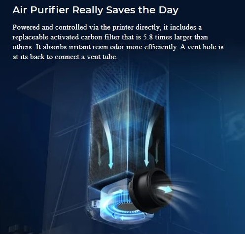 +Được cấp nguồn và điều khiển trực tiếp thông qua máy in, nó bao gồm một bộ lọc than hoạt tính có thể thay thế lớn hơn 5,8 lần so với các bộ lọc khác. Nó hấp thụ mùi nhựa gây kích ứng hiệu quả hơn