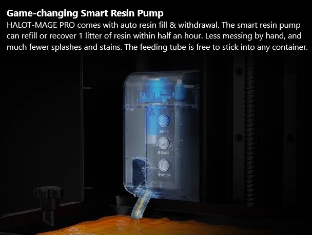 HALOT-MAGE PRO đi kèm với tính năng nạp và rút nhựa tự động. Nó có thể đổ đầy hoặc phục hồi 1 lít nhựa trong vòng nửa giờ. Ít lộn xộn hơn bằng tay, và ít vết bắn và vết bẩn hơn nhiều. Ống cho ăn có thể tự do dính vào bất kỳ vật chứa nào