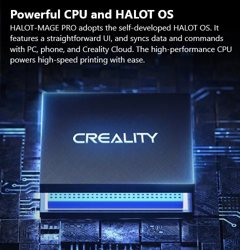 _HALOT-MAGE PRO sử dụng HĐH HALOT tự phát triển. Nó có giao diện người dùng đơn giản, đồng thời đồng bộ hóa dữ liệu và lệnh với PC, điện thoại và Creality Cloud. CPU hiệu năng cao hỗ trợ in tốc độ cao một cách dễ dàng
