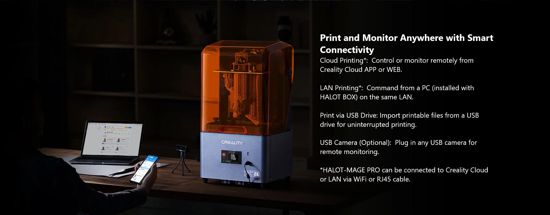 *HALOT-MAGE PRO có thể được kết nối với Creality Cloud hoặc LAN qua WiFi hoặc cáp RJ45