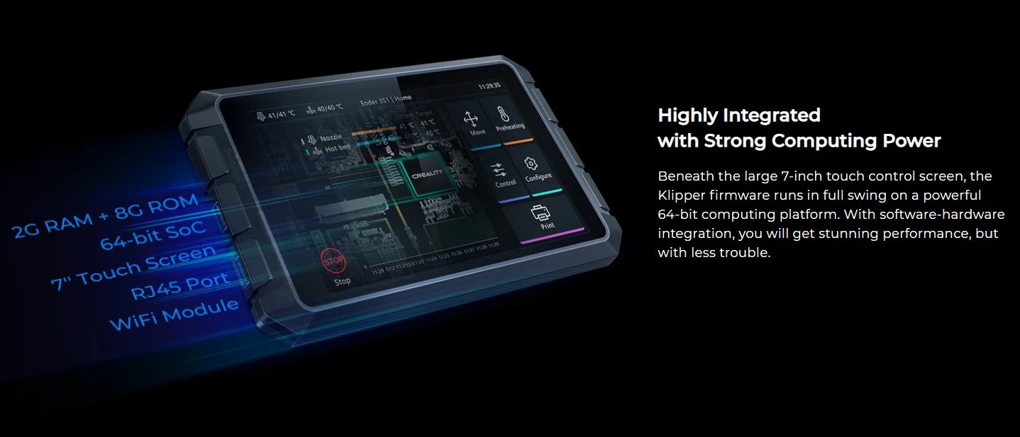 _Bên dưới màn hình điều khiển cảm ứng lớn 7 inch, phần sụn Klipper chạy hoàn toàn trên nền tảng điện toán 64-bit mạnh mẽ. Với sự tích hợp phần cứng-phần mềm, bạn sẽ có được hiệu suất ấn tượng nhưng ít gặp sự cố hơn.