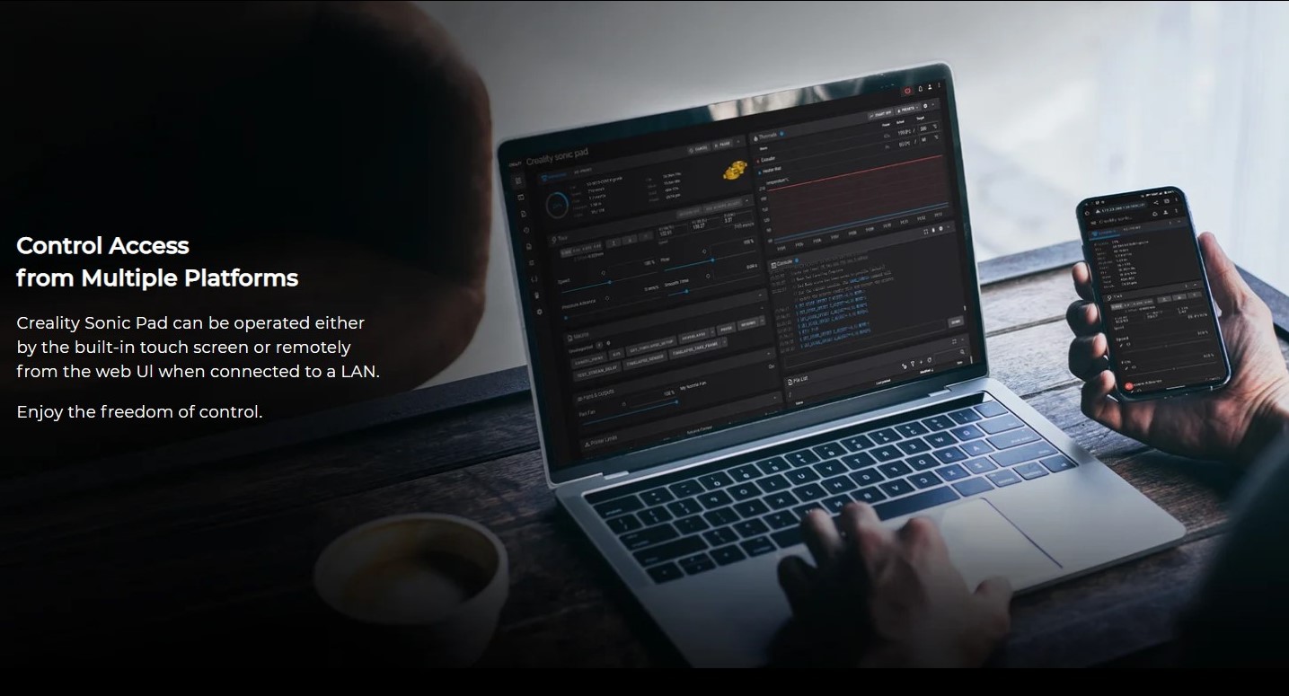 Creality Sonic Pad có thể được vận hành bằng màn hình cảm ứng tích hợp hoặc từ xa từ web Ul khi được kết nối với mạng LAN.