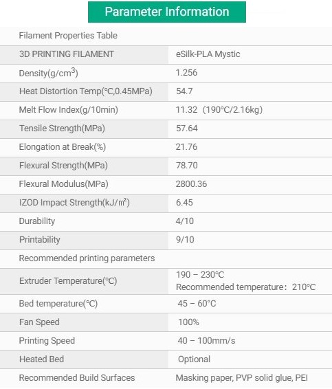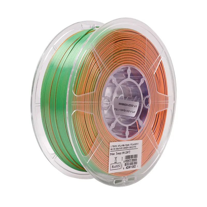 _Dây tóc PLA nhiều màu sẽ mang lại cho bạn cảm giác năng động tuyệt vời thông qua dải màu xen kẽ ba màu. Với kết cấu ánh lụa, bề mặt của eSilk-PLA Mystic mịn và không hiển thị các lớp hoa văn; Sợi tơ tằm dễ bóc, mịn và phẳng.