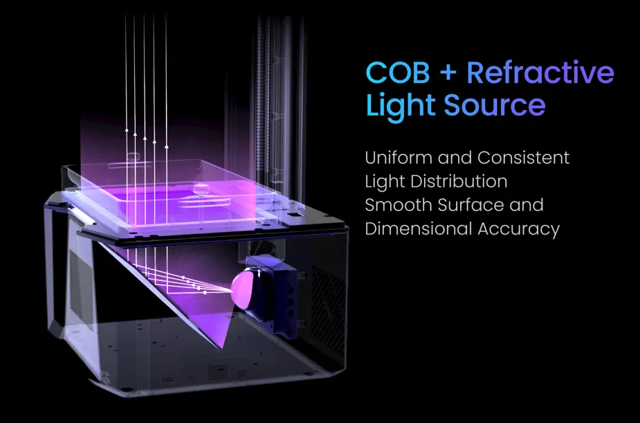 Sử dụng nguồn sáng khúc xạ COB+, làm giảm sự phân tán ánh sáng và cung cấp sự phân bố ánh sáng đồng đều và nhất quán, mang lại bản in chất lượng cao với bề mặt mịn và độ chính xác về kích thước