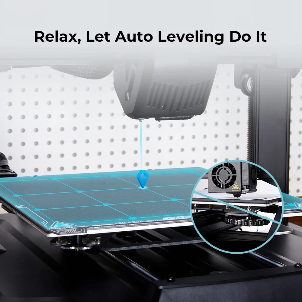 Ender-3 V3 SE có cảm biến CR Touch để tự động cân bằng và một cảm biến biến dạng để tự động bù Z. Không cần phải vặn vít hoặc kéo giấy. Chỉ cần nằm ngửa và tận hưởng thành công của bản in