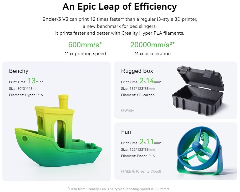 _Ender-3 V3 có thể in nhanh hơn 12 lần* so với máy in 3D i3-style thông thường, một chuẩn mực mới cho máy nằm giường. Nó in nhanh hơn và tốt hơn với sợi Creality Hyper PLA.