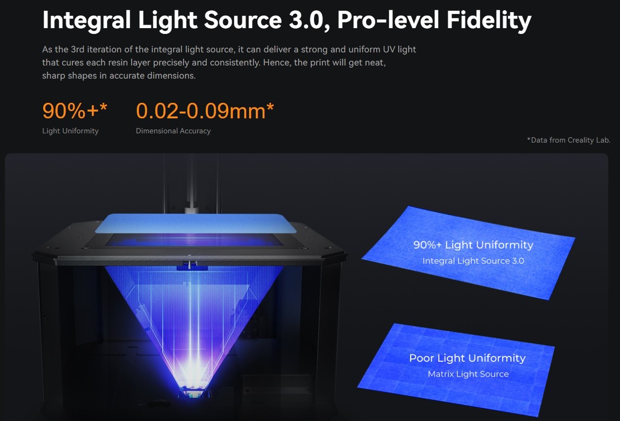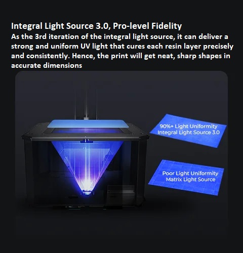 +Là phiên bản thứ 3 của nguồn sáng tích hợp, nó có thể phát ra tia UV mạnh và đồng đều giúp xử lý từng lớp nhựa một cách chính xác và nhất quán. Do đó, bản in sẽ gọn gàng, hình dạng sắc nét với kích thước chính xác.
