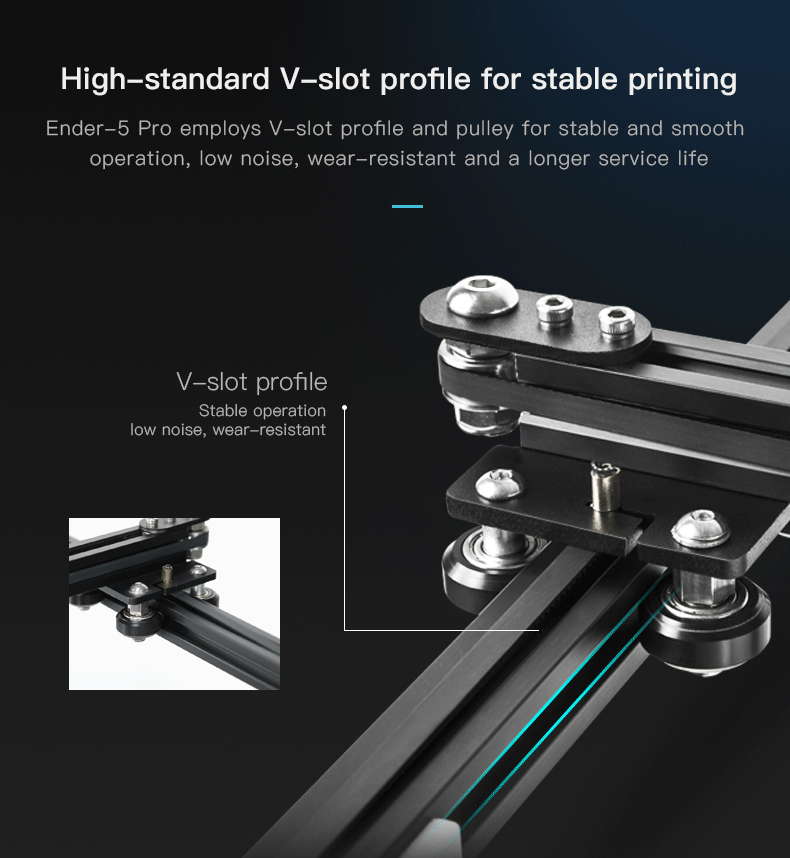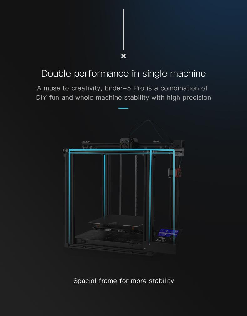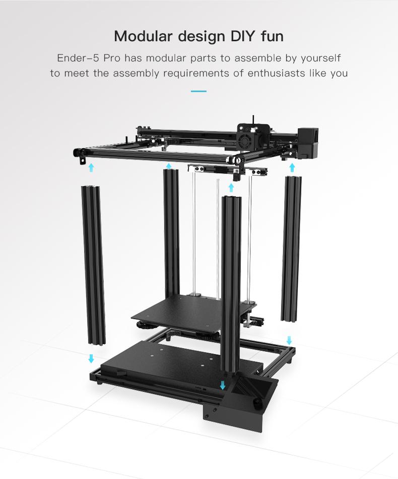 _Ender 5 Pro Printer là dạng máy in 3d cấu trúc khối, được thiết kế theo trục Y kép, bao gồm bo mạch chủ im lặng để tránh tiếng ồn xảy ra, cùng với một tấm nền mặt bàn in có thể tháo rời, những tính năng này giúp mở khóa việc in không bị gián đoạn của 100% nguồn cấp dữ liệu sợi từ đầu vào.