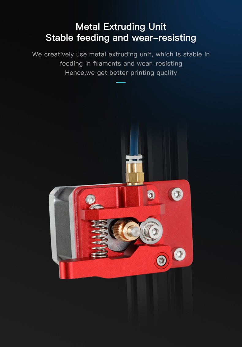 _Một bổ sung mới khác cho Ender 5 Pro là khung máy đùn kim loại có độ bền cao. Tính năng này cung cấp áp lực mạnh hơn trong khi đẩy sợi nhựa qua vòi phun của Máy in 3D, mà nhà sản xuất tuyên bố sẽ tăng cường hiệu suất in tổng thể. Bộ dụng cụ đùn kim loại nâng cấp này được trang bị một chốt điều chỉnh để người dùng có thể điều chỉnh áp suất của bánh răng đùn sao cho phù hợp nhất với bất kỳ loại sợi nhựa nào được chọn.
