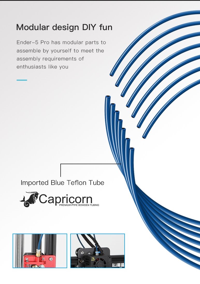 _Cuối cùng nhưng không kém phần quan trọng, Máy in 3D Creality Ender 5 Pro cũng bao gồm ống dẫn sợi nhựa mới và cải tiến. Ống Capricorn Bowden PTFE có đường kính trong 1,9mm ± 0,05mm, giảm bất kỳ khoảng trống dư thừa nào và ngăn không cho dây tóc bị xô lệch bên trong ống. Việc bổ sung ống cao cấp này làm cho Ender 5 Pro phù hợp hơn để in với các sợi nhựa dẻo linh hoạt và các vật liệu đặc biệt khác.