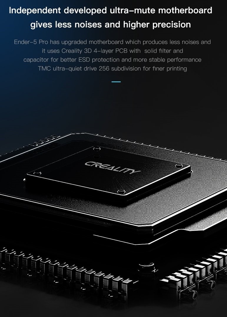 _Một thuộc tính duy nhất của Máy in 3D Ender 5 Pro là Mainboard V4.2.2 im lặng mới với trình điều khiển TMC2208, cho phép hiệu suất in êm hơn và chính xác hơn. Mainboard này được cài đặt cả Marlin 1.1.8 và Bootloader, đồng thời cũng được kích hoạt tính năng bảo vệ đường băng nhiệt, cung cấp khả năng bảo vệ bổ sung trong trường hợp máy in đạt nhiệt độ cao bất thường.