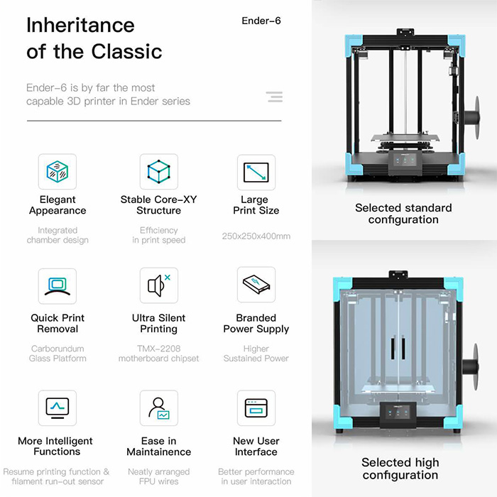 _Máy in 3d Creality Ender 6 cung cấp hầu hết các tính năng hiện đại như tiếp tục in sau khi mất điện và cảm biến chạy dây tóc và được trang bị các thành phần chất lượng như Meanwell PSU và ổ đĩa TMC2208 của Đức. Mặt khác, Creality được hưởng một cộng đồng lớn đóng góp các bản mod và nâng cấp tuyệt vời. Khi mọi thứ bắt đầu hỏng, bạn có thể nâng cấp nó bằng các sửa đổi do người dùng đóng góp. Vâng, bạn không thể bỏ lỡ