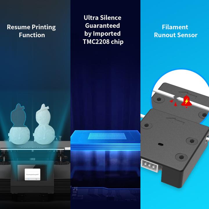 _Chức năng tiếp tục in: Máy có thể tự động tiếp tục in sau khi tắt nguồn hoặc sợi nhựa bị đứt gãy. Không phải lo lắng về lỗi in.