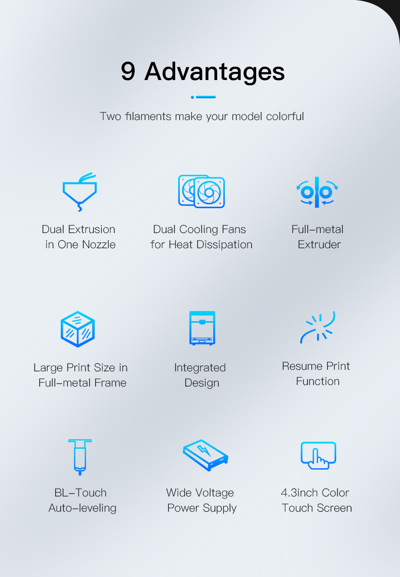+Máy in 3D FDM hai màu với đầu đùn kép thành một cấu trúc đầu phun dễ sử dụng và bảo trì hơn nhiều so với máy in 3D hai đầu phun truyền thống.