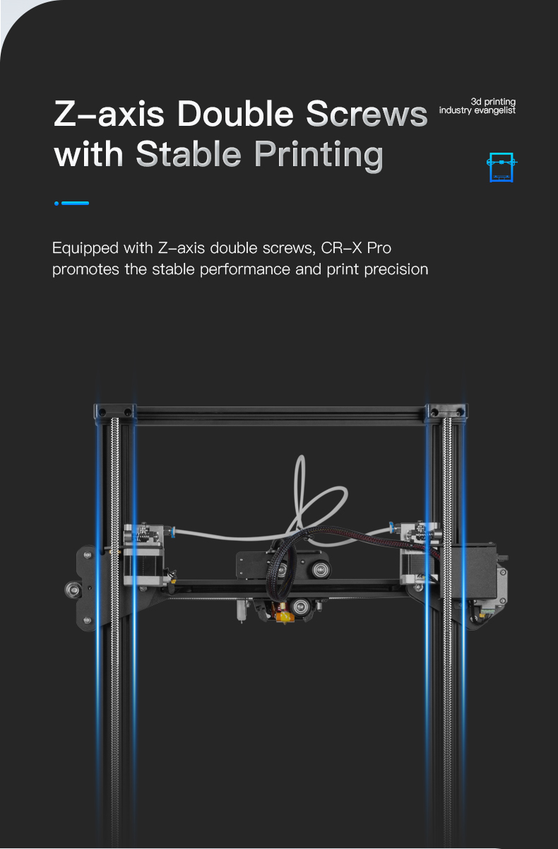 +Được trang bị vít đôi trục Z, máy in 3d Creality CR-X Pro FDM thúc đẩy hiệu suất ổn định và độ chính xác của bản in.