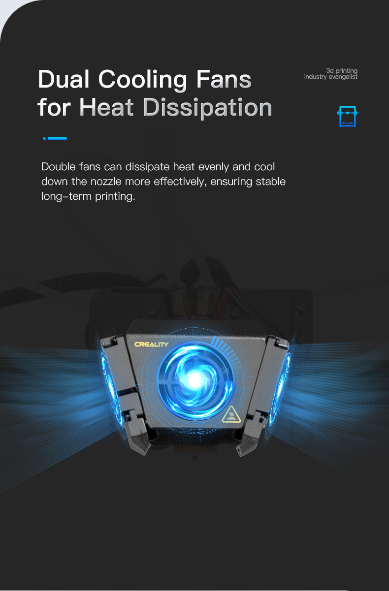 +Quạt đôi có thể tản nhiệt đều và làm mát đầu phun hiệu quả hơn, đảm bảo in lâu dài ổn định.
