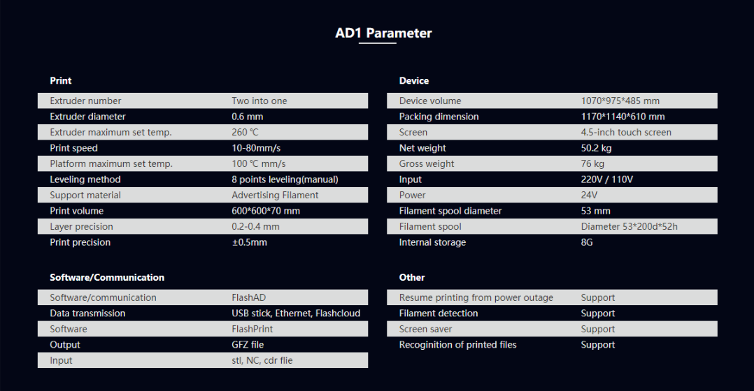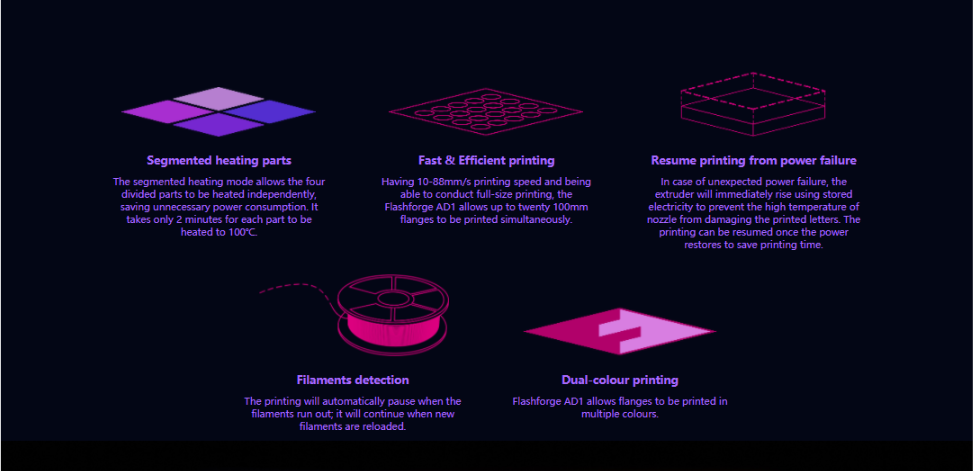 Có tốc độ in 10-88mm / s và có thể tiến hành in ở kích thước đầy đủ, Flashforge AD1 cho phép in đồng thời hai mươi mặt bích 100mm.