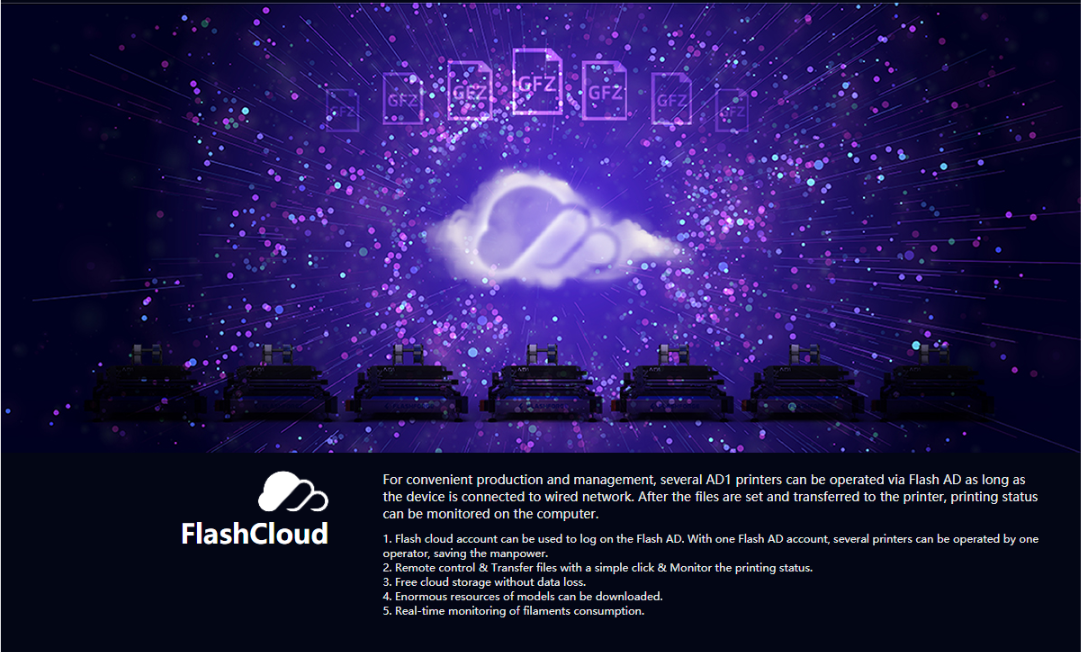 _Để sản xuất và quản lý thuận tiện, một số máy in AD1 có thể được vận hành qua Flash AD miễn là thiết bị được kết nối với mạng có dây. Sau khi các tập tin được đặt và chuyển đến máy in, bạn có thể theo dõi trạng thái in trên máy tính.
