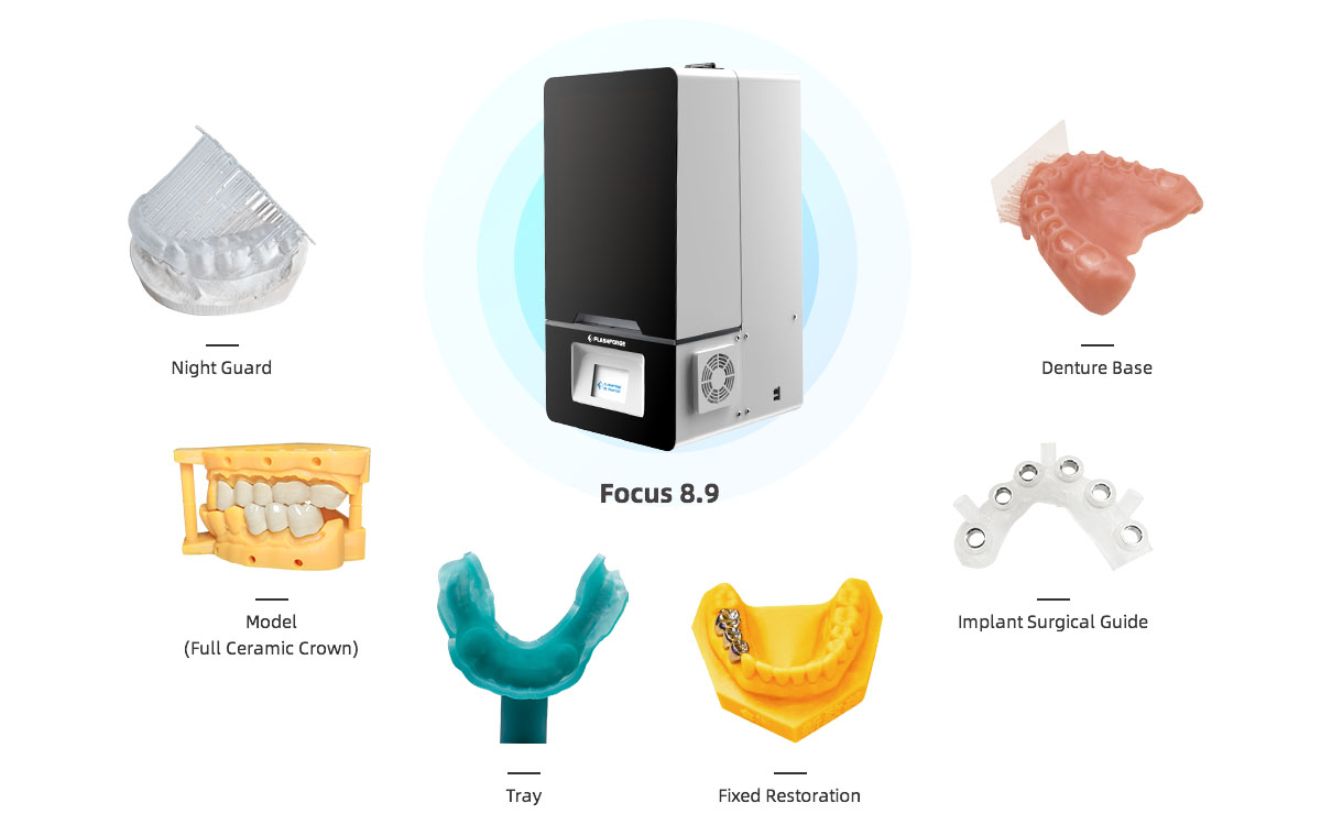Được trang bị công nghệ sản xuất thông minh mới nhất do Flashforge phát triển, Focus 8.9 đã được cải thiện đáng kể về kích thước in, độ chính xác và độ ổn định, và hiện có sẵn cho các ứng dụng khác nhau như chỉnh nha & bộ phận giả trong nha khoa.