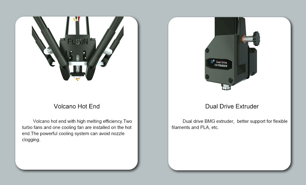 +Hotend Volcano với hiệu suất nóng chảy cao. Hai quạt tuabin và một quạt làm mát được lắp trên đầu nóng. Hệ thống làm mát mạnh mẽ có thể tránh tắc vòi phun.
