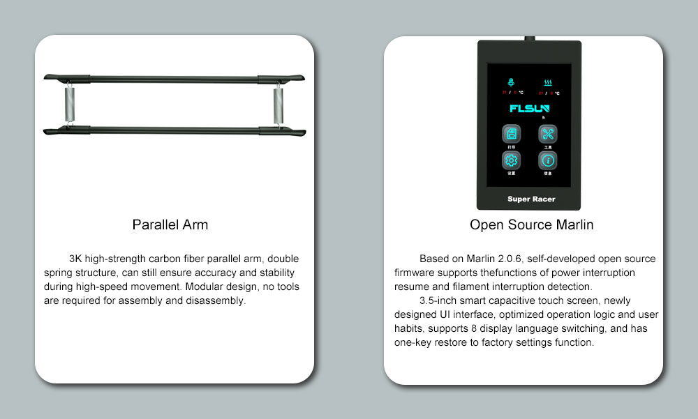 +Tay đòn song song bằng sợi carbon độ bền cao 3K, kết cấu lò xo kép, vẫn có thể đảm bảo độ chính xác và ổn định trong quá trình di chuyển tốc độ cao. Thiết kế mô-đun, không cần công cụ để lắp ráp và tháo rời.