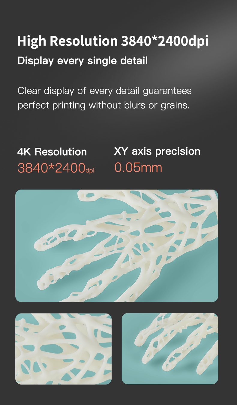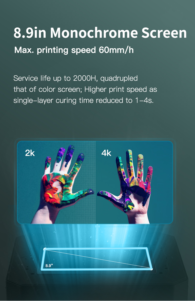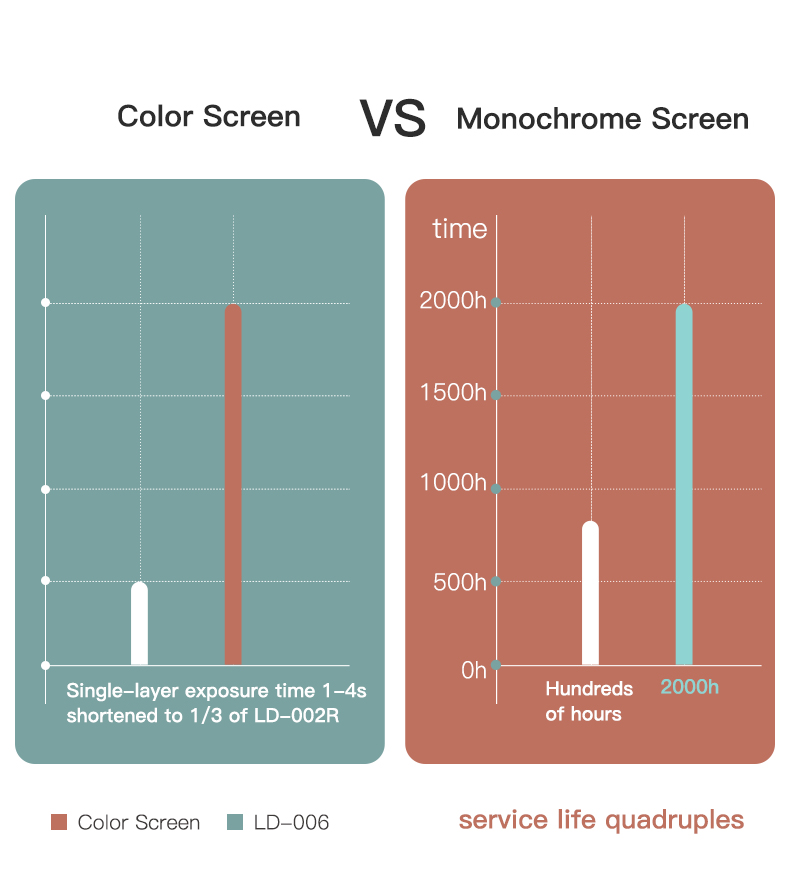 +Tuổi thọ lên đến 2000H tăng gấp bốn lần so với màn hình màu; Tốc độ in cao hơn khi thời gian đóng rắn một lớp giảm xuống còn 1-4 giây.