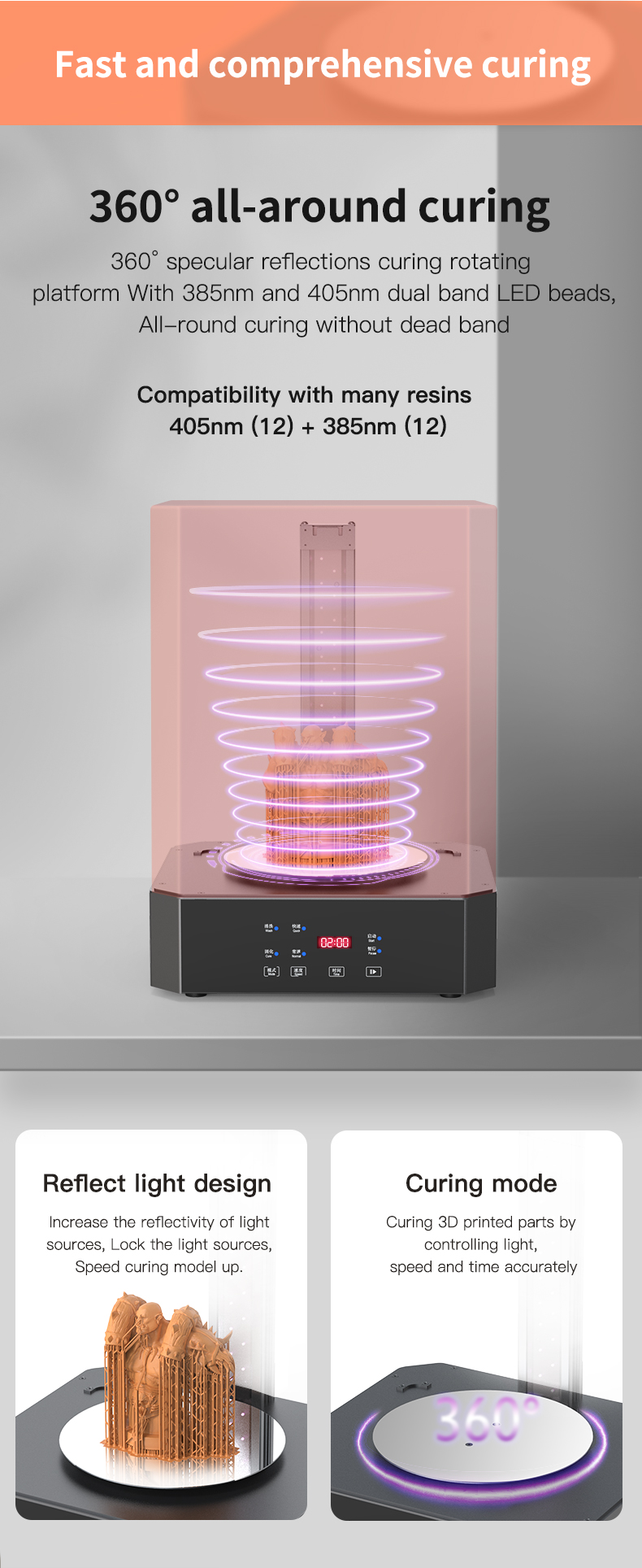 +Bàn xoay xử lý phản xạ 360° đầu dò với các hạt LED dải kép 385nm và 405nm, phơi sáng đóng rắn toàn diện mà không có dải chết.